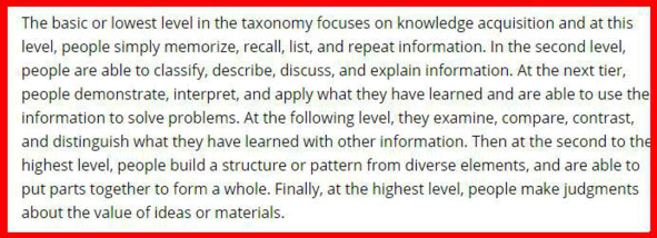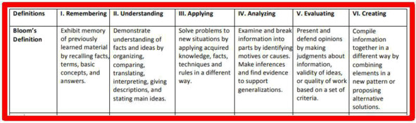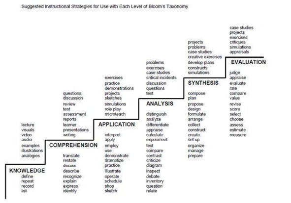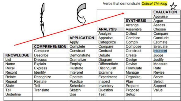 Benjamin Bloom created a taxonomy of measurable verbs to help us describe and classify observable knowledge, skills, attitudes, behaviors and abilities. The theory is based upon the idea that there are levels of observable actions that indicate something is happening in the brain (cognitive activity.) By creating learning objectives using measurable verbs, you indicate explicitly what the student must do in order to demonstrate learning. Verbs that demonstrate Critical Thinking