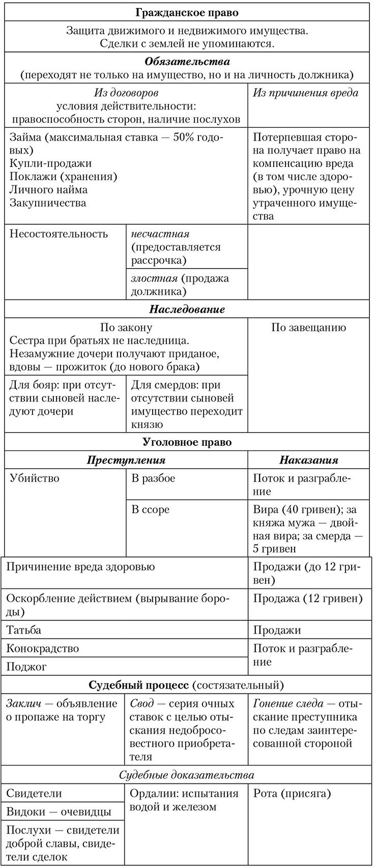 Семейное право. Брачно-семейные отношения регулировались не Русской Правдой, а Уставами Великих князей и нормами церкви, так как входили в сферу церковной юрисдикции. Брачный возраст у мужчин составлял 15 лет, у женщин – 13 лет. Формально брак требовал свободы воли вступающих в него (хотя в действительности достаточно было согласия родителей). Самовольные разводы (роспусты) воспрещались и наказывались штрафами. Согласно Уставу князя Ярослава, размер штрафа за развод зависел от того, был ли брак венчанным, штраф за расторжение невенчанного брака был в два раза ниже: «Аще муж роспустится с женою по своей воли, а будеть ли венчальная, и дадять митрополиту 12 гривен, будеть ли невенчальная, митрополиту 6 гривен». На заре распространения христианства на Руси церковь не могла настаивать на исключительно конфессиональной форме брака, но требовала моногамии. Поводы к прекращению брака определялись Византийским законодательством, к ним относились: прелюбодеяние жены, (но не мужа), неспособность к брачному сожительству, постриг одного из супругов (влек обязательный постриг и другого), проказа, злоумышление жены против мужа. Дети находились в родительской власти, родители могли распоряжаться личностью детей и продать их в холопы. За убийство детей родители наказывались исключительно церковью (это деяние считалось грехом и требовало наложения епитимьи (греч. πιτιμα— наказание).