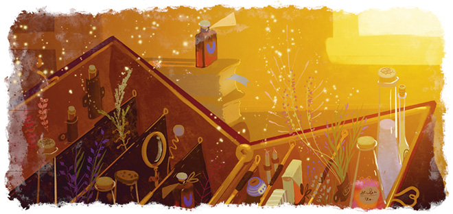 Майстер Раулс улыбнулся, и у него в руках откуда-то появился небольшой кожаный чемоданчик, внутри которого обнаружился целый склад холщовых мешочков, бумажных пакетиков и хрупких на вид скляночек. Некоторые из них слабо светились, некоторые слегка дрожали, некоторые похрустывали и позвякивали. В одних стеклянных пузырьках были порошки, в других – разноцветные жидкости, в третьих – гранулы, в четвёртых – что-то очень похожее на снег.