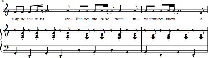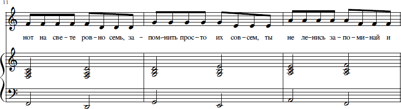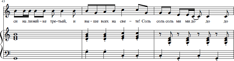 Песня «Живут на свете ноты» знакомит юного музыканта с основами нотной грамоты. Она рассказывает, зачем нужны ноты и для чего их нужно знать; сколько всего нот, как они называются и как звучат. С помощью этой песенки дети быстро запоминают понятия «нотный стан», скрипичный ключ. Знакомятся с расположением нот на нотном стане и учатся петь звукоряд. В работе с этим номером, для наглядности, рекомендуется использовать изображение нотного стана со звукорядом выстроенным от «До». На нем ученики указывают на исполняемую ноту, нотный стан, скрипичный ключ.