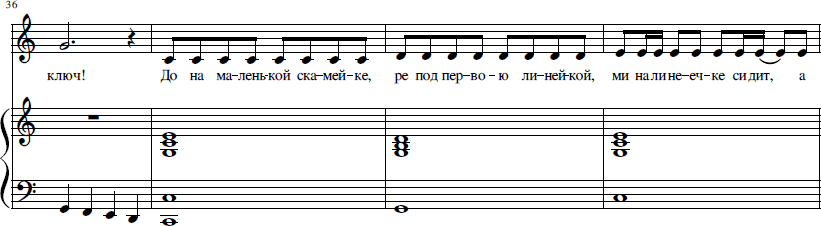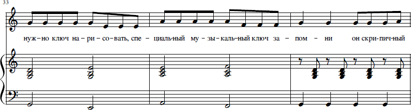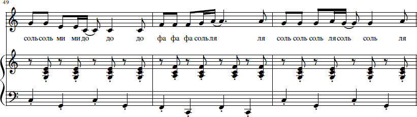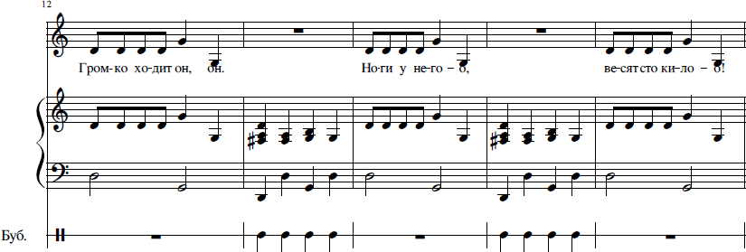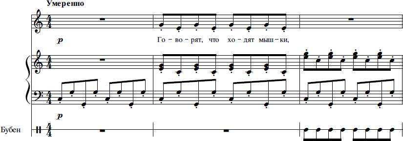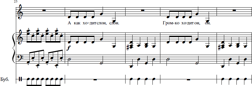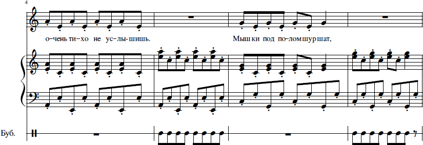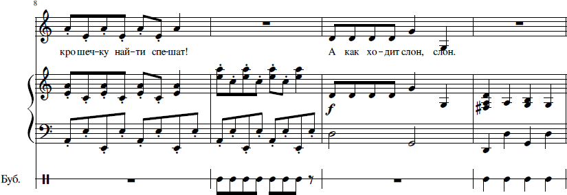 Песенка «Мышки и слоны» знакомит с долгими и короткими длительностями в музыке. Как ходят мышки? У них маленькие ножки, и они быстро перебирают ими, делая короткие шажки. А огромный слон неспешно переставляет свои большие ноги. В работе с этим материалом необходимо использовать шумовые инструменты. Отлично подойдут бубны, деревянные ложки или клавесы.
