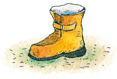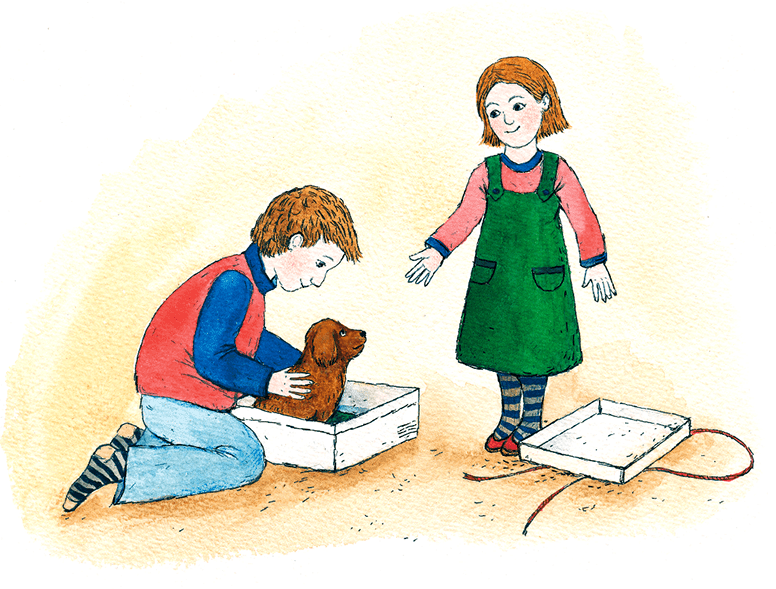 Бабушка достала из сумки коробку, открыла крышку, и все ахнули. На ботинках сидел маленький коричневый щенок и жмурился от света.