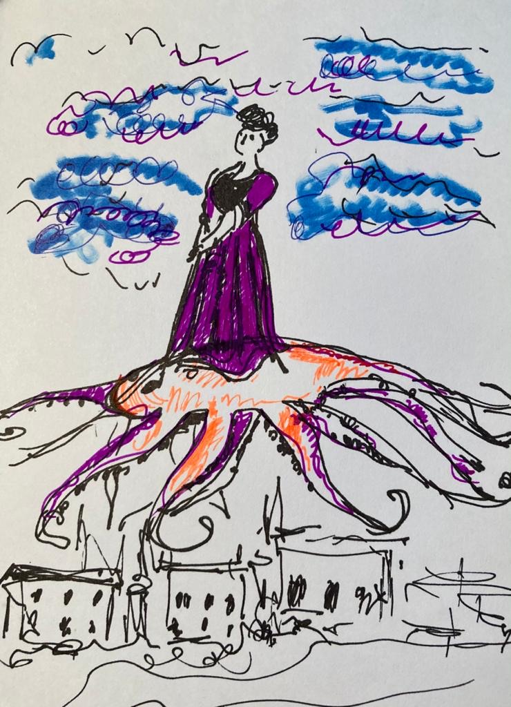 "Почему же так долго ничего не происходит?» – подумала Марта- пора начинать по-настоящему фантазировать". И она закрыла глаза, а когда открыла их, слегка остолбенела. С неба спустился большой разноцветный осьминог, на его спине сидела чернокожая женщина и ослепительно улыбалась. "Может быть, это и слишком, но я просто захотела полетать. А у этого мира прекрасное чувство