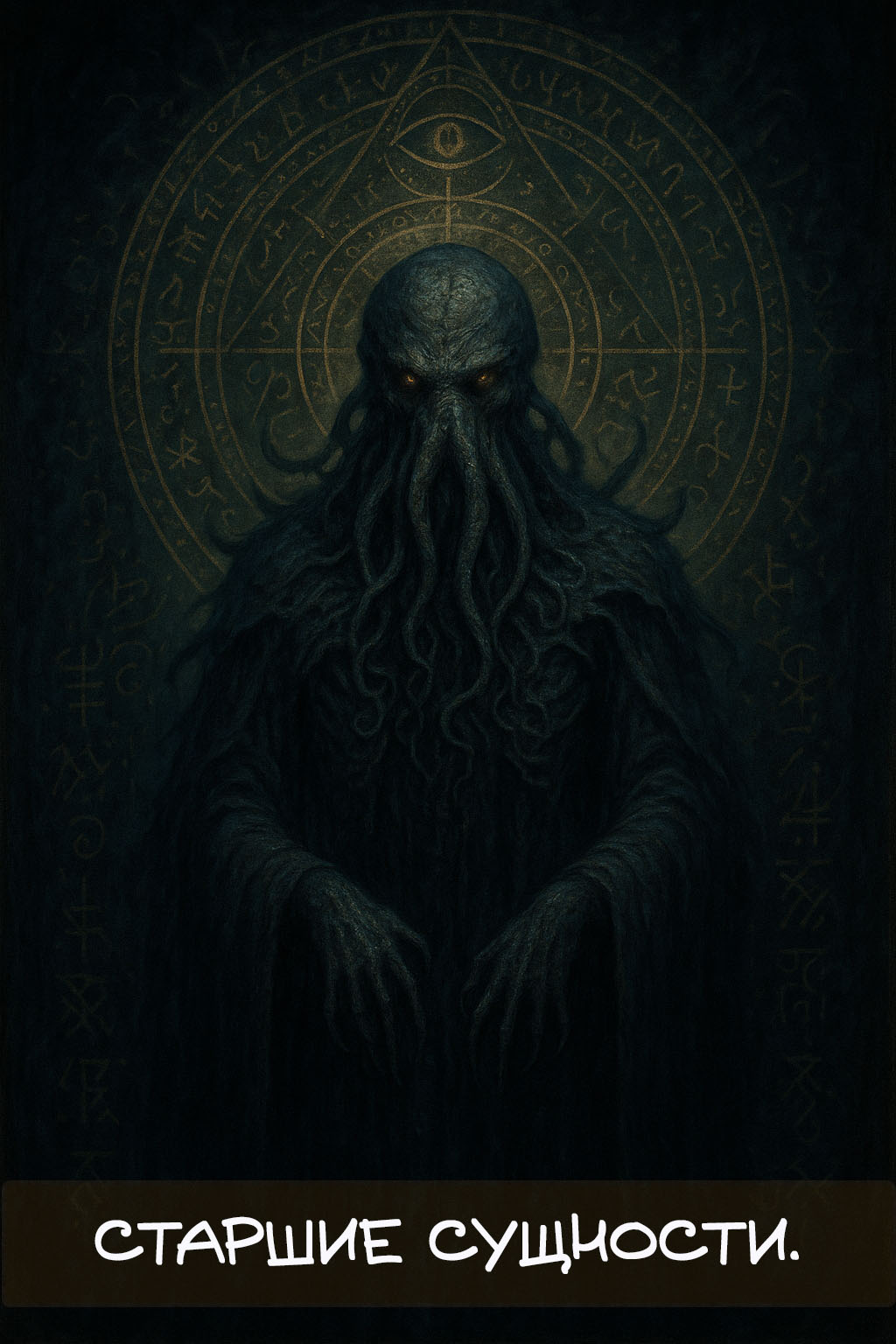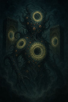 На изображении мы видим фигуру, которая выглядит как древнее существо, покрытое извивающимися темными щупальцами, устремленными в разные стороны. В его теле и вокруг него – несколько кругов, похожих на окна или порталы, наполненные таинственными письменами и глазами, которые постоянно следят за вами.