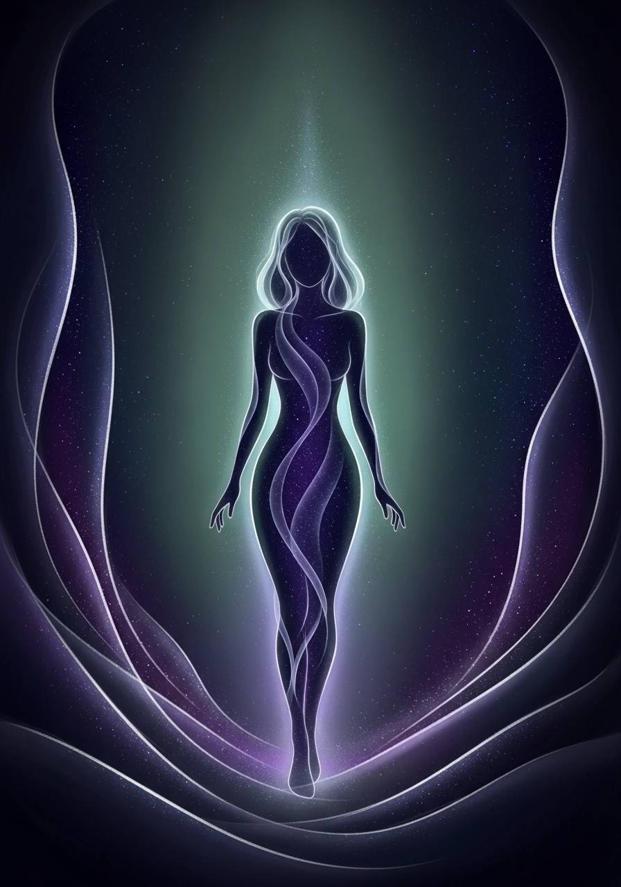 Ветер затих, звёзды, словно затаили дыхание. Тишина стала глубокой и густой, как бархат. Через мгновение ночная тьма начала сгущаться и вскоре пред Душой предстала сама Ночь. Ее космический лик был темен и полон бездонной мудрости, от ее глаз словно исходил мягкий, словно лунный свет.