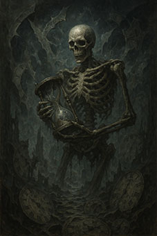 Перед вами возникает мрачный скелет гигантских размеров, возвышающийся над безликми руинами. В его костлявых руках – огромные песочные часы, в которых закован свет ускользающего времени; по поверхности стекла ползут трещины. Вокруг – искажающееся пространство, заполненное обломками часов и циферблатов, чьи стрелки остановлены или искажены неумолимой разрушающей силой. Всё погружено в хаотический морок: время застыло и разрушилось, прошлое, настоящее и будущее потеряли свои границы.