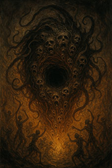Изображение наполнено вихрями потусторонней тьмы: зев бездонной чёрной бездны, сползающие вниз образы множества мучающих лиц, хаотичные тени, извивающиеся в причудливом танце вокруг этого ядра. Картина кажется порталом, который не удерживает ни свет, ни структуру, а только тянет вглубь туда, где любая личность растворяется в первобытной тьме.