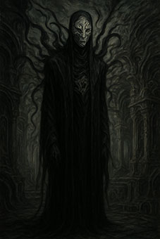 Фигура в центре – высокая, черная, закутанная в живое покрывало тьмы. Ее лицо – маска, вырезанная как будто из кости или из иного нематериального вещества, полная изломанных черт и странного изящества. За ней из тьмы тянутся щупальца – не просто отростки, а волны искажения, идущие в пространство, как корни или антенны, улавливающие разум. Всё пространство искажено, как будто само пространство гниёт под её присутствием.