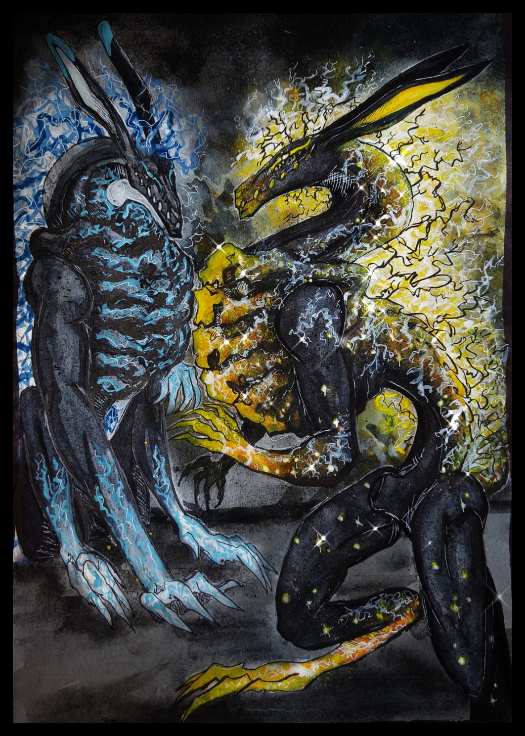 Один из них был золотисто-чёрный, а на тёмной коже второго искрились завитки молний бело-голубого оттенка. Раньше он уже видел золотого во всей его красе – это Искра. Грозный и жутко навязчивый. А вот Электро ещё ни разу не показывался взору Кристофера. Удивительно было наблюдать, насколько похожи двое братьев и одновременно как разительно они отличаются по цветовой гамме. Гребни обоих опасно полыхали сотней золотисто-голубых молний, становясь больше и опасней.