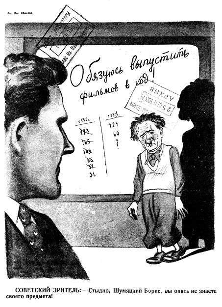 Тем не менее актуальной оставалась задача увеличения объемов продукции, и в прессе задавали вопрос, по какой причине Шумяцкий не выполняет обещания. В 1937 г. журнал «Крокодил» опубликовал карикатуру, высмеивающую беспорядочные попытки выполнить план, с подписью: «Советский зритель: „Стыдно, Шумяцкий Борис, вы опять не знаете своего предмета!“» (рис. 1). Сатирики и представления не имели, как тяжело было выполнить план.