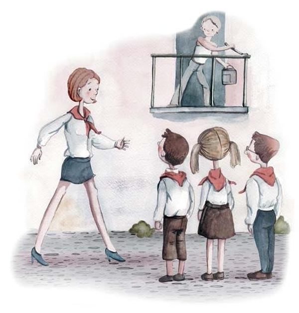 А на школьном дворе Будущая Бабушка учила пионеров ходить строем и поворачиваться направо, налево и кругом, не наступая друг другу на пятки. Будущий Дедушка так засмотрелся на Будущую Бабушку, что закапал вареньем всю майку – и даже не заметил этого. Потому что Будущая Бабушка была прекрасна. У неё были рыжие волосы, очень короткая юбка, блестящие колготки и туфли на высоком каблуке.