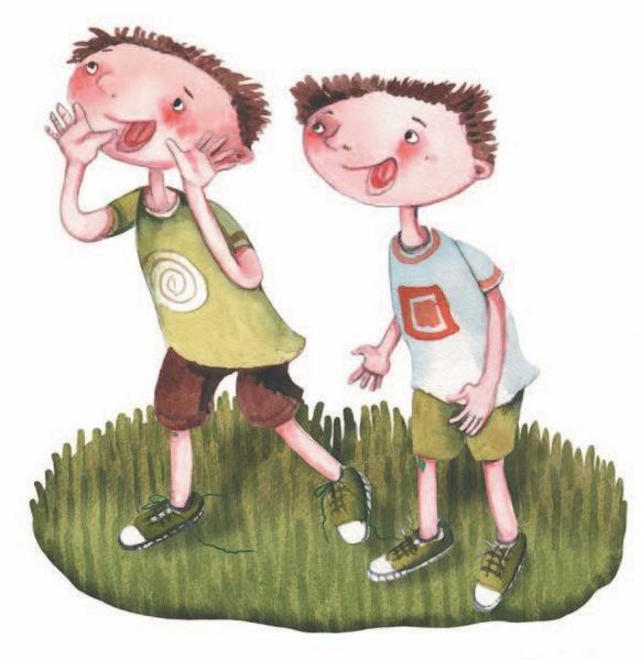 У подъезда стояли наши близнецы, Димка и Тимка. Они совершенно одинаковые, даже стукнуться умудряются в одном и том же месте. Вот и теперь у каждого из них была поцарапана левая щека и закрашена зелёнкой правая коленка. Зато Димка никогда не шнурует ботинки. Поэтому его всегда можно узнать – шнурки тянутся за ним.