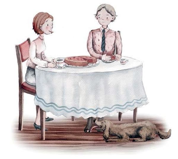 Дома у Бабушки жил большеухий лохматый пёс. Дедушка сразу его погладил – чтобы показать, как он любит животных. Потом они ели вишнёвый пирог. Псу тоже достался кусочек, и он, чавкая, жевал его под столом.