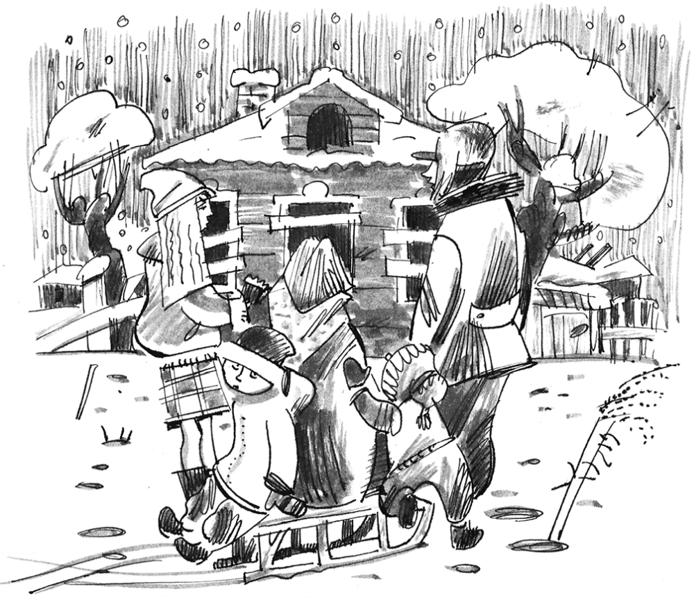 Мы собрались быстро, даже Сашка, который очень не любит одеваться. Он сам влез в свой комбинезон, я только застегнула «молнию». Васька завязал ему шапку. А про варежки мы забыли. Поэтому мама в конце концов взяла его к себе на санки с одеялом и стала дуть на руки.