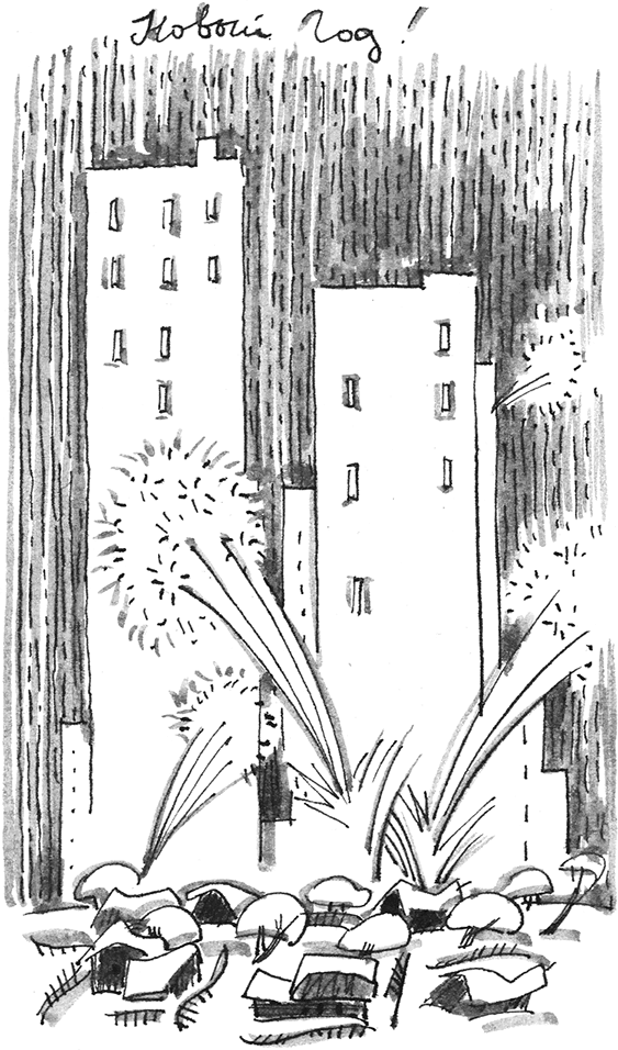 Сашка немедленно проснулся и запрыгал вокруг него, Васька начал бегать кругами. Папа достал из мешка елочные игрушки, мишуру, свечки, цветы. Мы украсили печку, развесили мишуру на окна, и дом стал немного похож на наш прежний крепкий дом, где мы встречали все праздники. Только слегка темноватым в этот раз выдался праздник, с одним только фонариком, с одной только печкой. Вдруг на улице загрохало, засверкало. Это наступил новый год, и все наши соседи из шестнадцатиэтажного дома, знакомые и незнакомые, вышли на улицу праздновать.