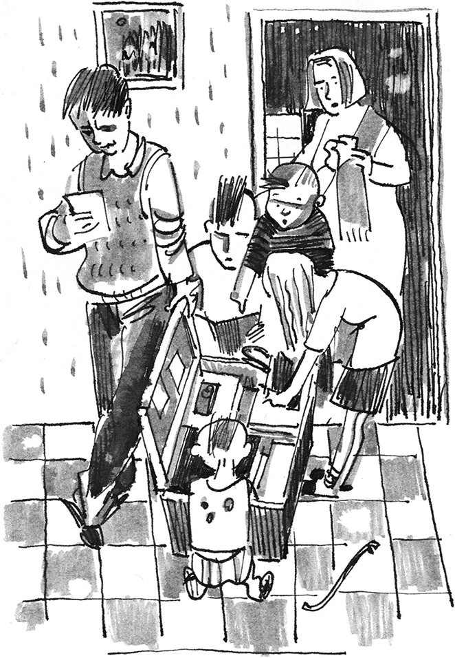 Этот ящик хранился у дяди Толи. Как только они подняли его к себе? Хоть и на лифте, но до него же еще нужно дотащить. Мы в таких ящиках из заборных досок храним картошку, но у них хотя бы ручки есть, а у этого нет, приходится браться за дно. Папа с Глебом взялись с двух сторон, но папе неудобно – у него же трость в руке. Надо или бросать ее, или не трогать ящик. Он передал мне свою палку и сразу стал сильнее хромать. Когда же он вылечится? Во дворе новые соседи на него сначала оглядывались, как будто это какое-то чудо – человек с тростью! В деревне-то все знали, что наш папа то больше, то меньше хромает, никто внимания не обращает. Здесь тоже привыкнут, но пока еще не привыкли.