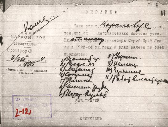 Справка о сдаче зачетов в стройпрофшколе. 1924 год