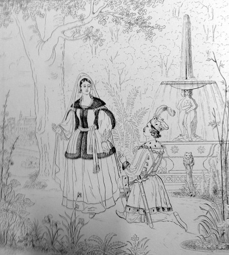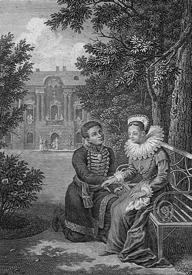Ил. 5. Самозванец и Марина Мнишек в саду Самборского замка. Ил. в книге: Булгарин Ф. Димитрий Самозванец. 1830