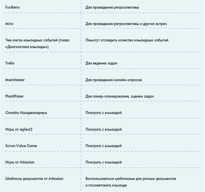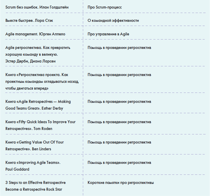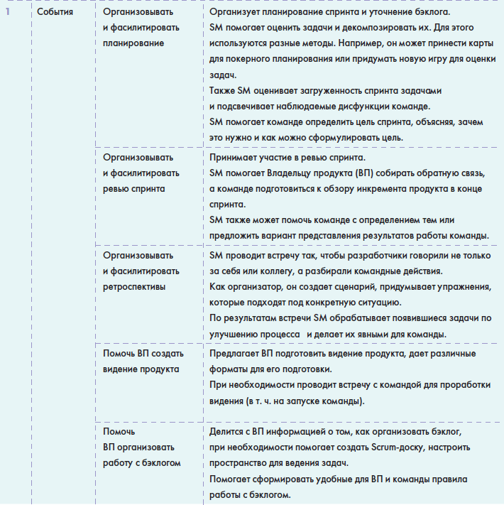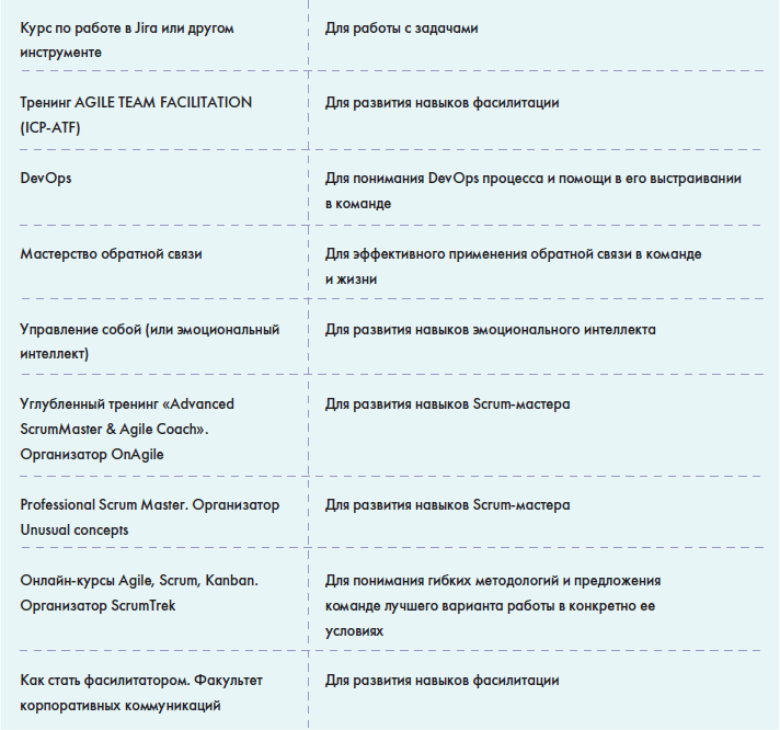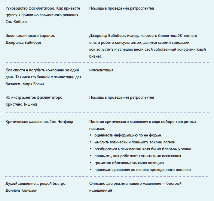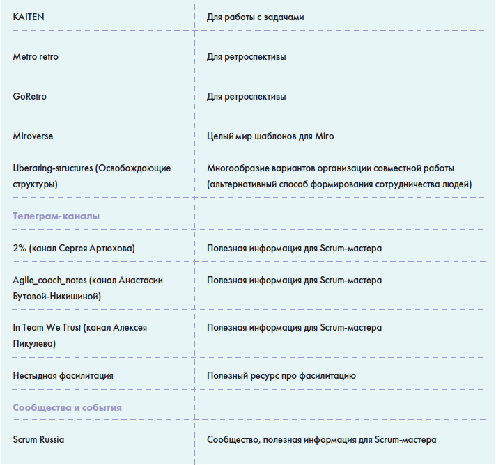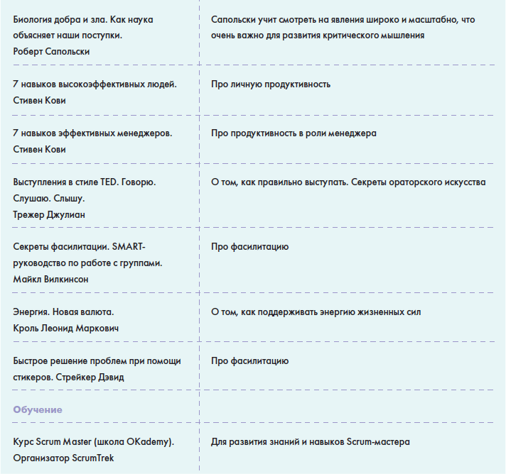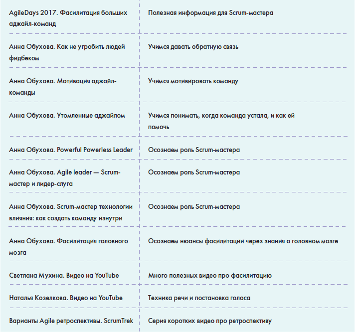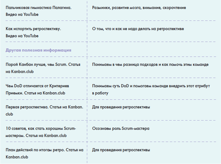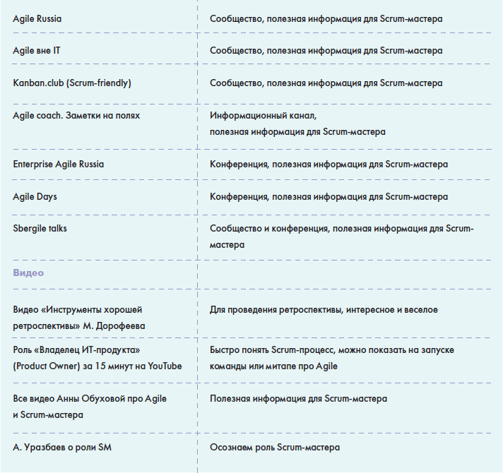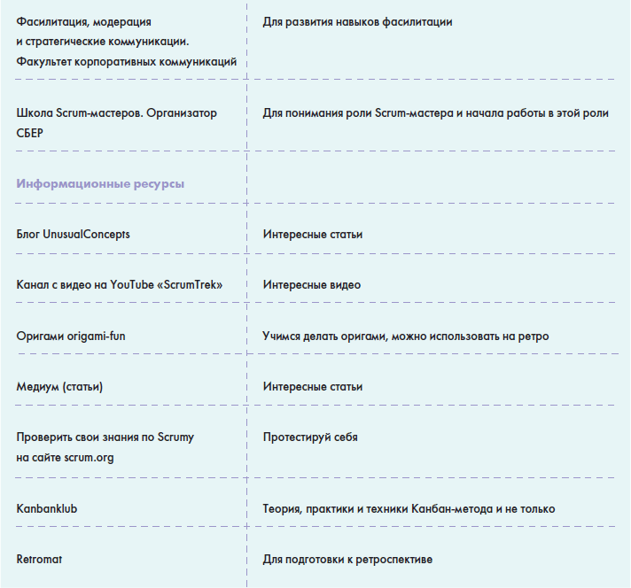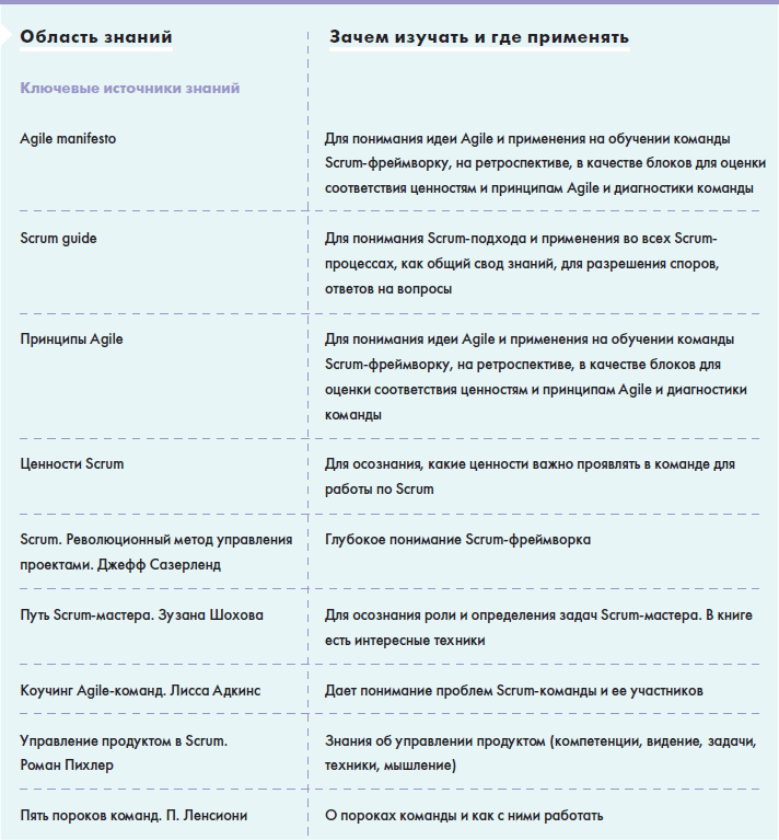 • В главе «Источники знаний» вы найдете информацию о том, как можно понять, что вы обладаете необходимыми знаниями для работы в данной роли и как можете оценить сами себя, а также большую таблицу с многообразием полезной информации для Scrum-мастера: от литературы до различных сообществ в социальных сетях.
