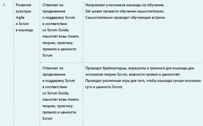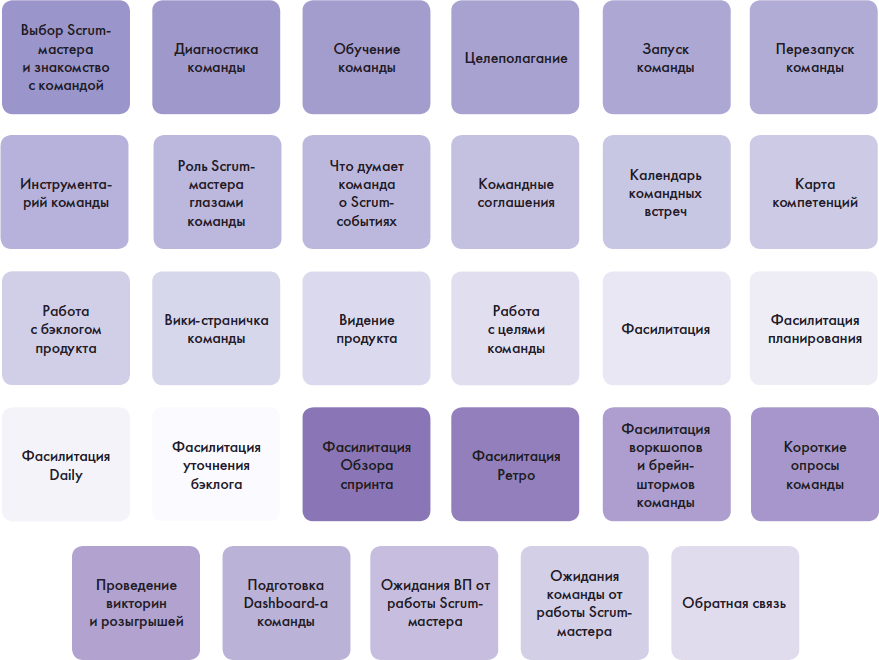 • В главе «Задачи Scrum-мастера» вы найдете описание зон ответственности Scrum-мастера, подробную матрицу задач Scrum-мастера, модель развития и эволюции в этой роли.