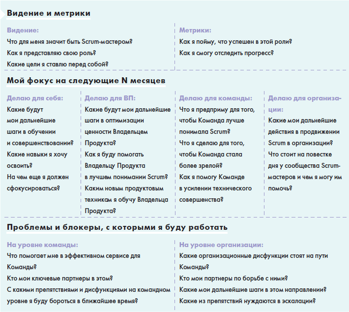Scrum-мастер может составить для себя канвас, чтобы понять, зачем он пришел в эту роль, какие перед ним стоят задачи и какие изменения он хочет привнести в команду и/или организацию.