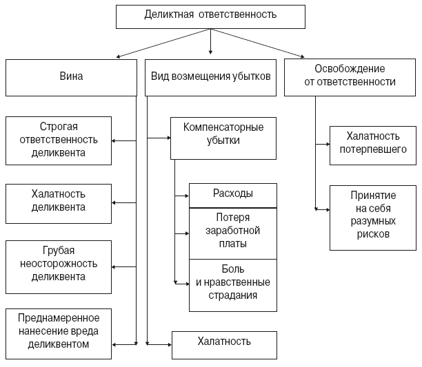 Соотношение вины и ответственности определяется через совокупность тесно связанных между собой явлений. С одной стороны, исследуется преднамеренный характер совершаемого деликта. С другой стороны, деликтное поведение оценивается на предмет возможности его признания неосторожный поведением. В других случаях даже при соблюдении всех возможных мер предосторожности лицо, совершившее деликт, все же признается ответственными. Это называют строгой ответственностью[32]. Примером строгой ответственности может служить случай, когда производителем выставлен на продажу дефектный товар, который, несмотря на наличие дефектов, все же попадает на рынок, при том что при его производстве были предприняты все возможные меры предосторожности, включая проверку контроля качества. Во многих правопоряд-ках в случае, если такой товар наносит вред потребителю, то ответственность имеет деликтный характер и возлагается на производителя этого товара. Рене Саватье объяснял развитие ответственности, выходящей за пределы вины, соединением двух факторов: машины и рабочего[33].
