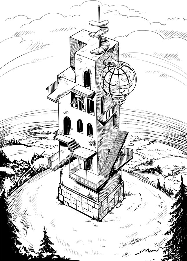 Дракон улетел, а Бусинку влекло все дальше от города. Ей казалось, что она летит свободно, как никогда. Что все пути ей открыты. Но так ли это было? Слишком уж целенаправленно ее тянуло… куда? Вдали, над поросшими лесом холмами, показалась башня, и это была самая странная башня, которую когда либо видела бусинка. Да что бусинка – вряд ли кто-то вообще во всей сказочной стране видел более необычное сооружение. Башня стояла на вершине небольшого лысого холма, вокруг которого обегала речка, умело изображая из себя систему прудов. Сооружение было из серого, тронутого мхами камня, квадратное и не очень высокое – этажей шесть, если судить по окнам… Или по дверям? А может, по лестницам? Окна и двери у башни были в самых странных местах. Некоторые двери связывали наружные лестницы. Некоторые лестницы ничего не связывали, а просто вели в никуда. Нижний этаж, совсем лишенный как окон, так и дверей, был очень высоким (хотя, может изнутри там было и два этажа? Или все три?). А верхнему этажу недоставало квадратной части, как будто с крыши башни сняли один из четырех кубиков. Получилось что-то вроде балкона. С другой стороны от этого балкона к стене Башни крепилось весьма замысловатое сооружение: вроде огромной шарообразной металлической клетки, с нижней части которой свисала совсем уж несуразная конструкция, похожая на клубок зеркальных змей. В клетке сидело облако. И туда же перемешанный с магией ветер неумолимо затягивал бусинку. Ситуация не казалась особо угрожающей, но все же бусинка слишком долго мечтала о свободе, чтобы так просто сдаться. И пролетая мимо окна на четвертом этаже Башни, она ловко юркнула внутрь. Ловко, да не слишком, потому что не успела бусинка осмотреться, как ее схватили.