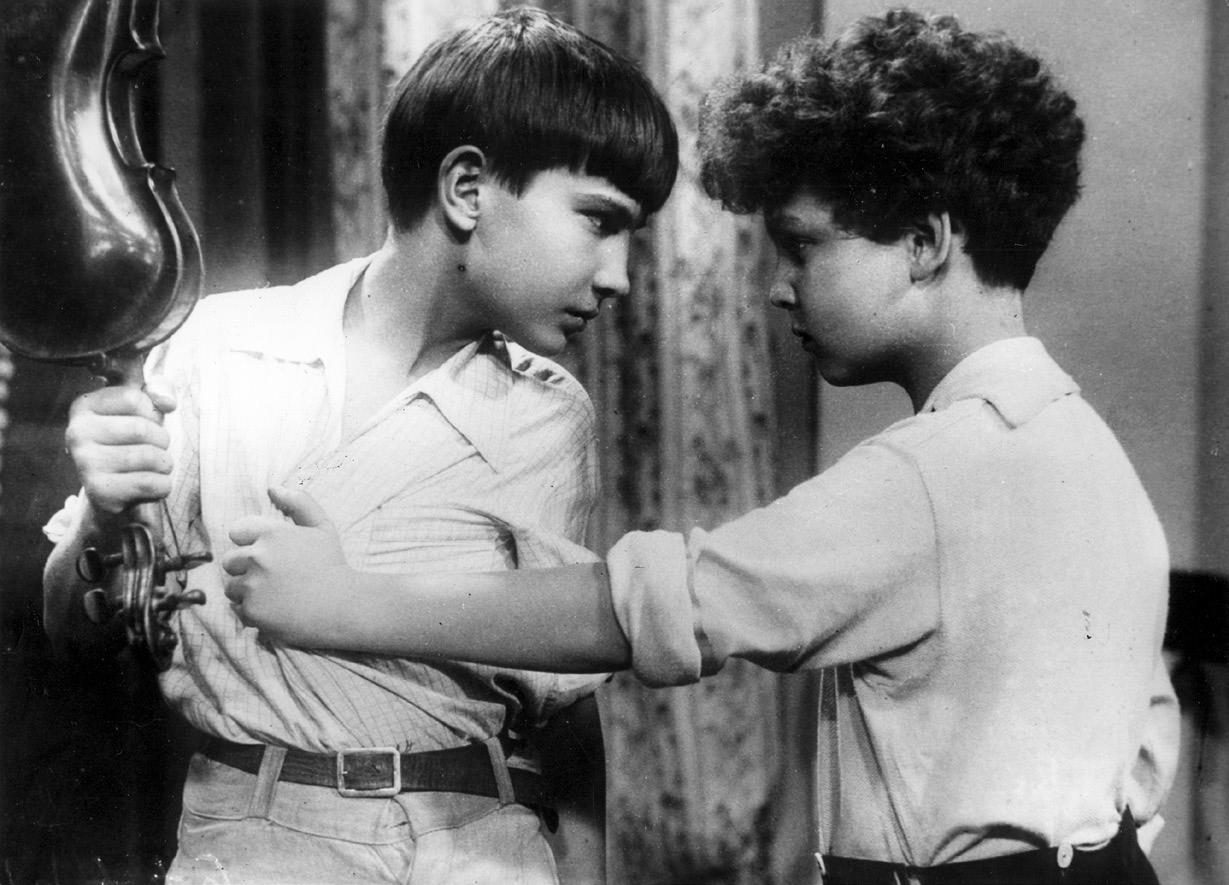 Дружба Янки и Владика так непреложна, что становится физическим законом детского мира: обстоятельства способны поколебать отношение взрослых к детям, нарушать уклад, вызывать бури (вроде той, что поднялась в семье Владика, когда отец Янки отказался с ним заниматься), но самого́ душевного расположения мальчишек они задеть не могут. Это даже не испытание дружбы, потому что под стеклянный ее колпак не проникают громовые раскаты. О чем тогда говорит сюжет? О свойствах дружбы как физического закона, если хотите. О том, как она, будучи величиной постоянной, уравновешивает мир, готовый сойти с орбиты. Фильм поэтому начат образом детского хора, поющего песню о самой прекрасной стране,– и метафора связывает образ государства, которого в фильме будто бы нет, с образом дружбы, который в фильме есть. Этот маленький идеологический реверанс, такой обычный в раннем советском кино, невозможно воспринимать иначе, как культурный код. Он проходит сквозь фильм мотивом и повторяется еще трижды, а ближе к финалу дополняется самой значимой деталью – портретом Сталина на стене вагона, в котором одаренные дети едут в Москву.