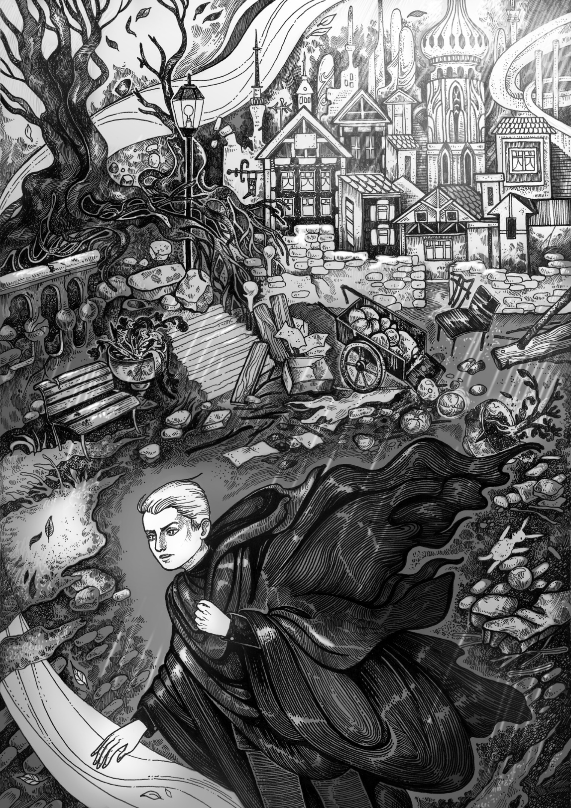 Он прошел мимо опустевших улиц, заваленных оборванными ураганом ветками и украшениями – теперь они уже выглядели не столь яркими и праздничными. Мимо роскошных домов с выбитыми ветром окнами, мимо раскрошенных в щепки торговых рядов, мимо разбитых экипажей. Не все успели укрыться от непогоды, и улицы были полны стонов раненых людей, пытавшихся выбраться из-под обломков. Даже Великое Дерево на центральной площади теперь нагое, с содранными ветром листьями, с поломанными ветвями, выглядело уже не столь величественным. Волшебные плоды валялись на земле между обломков и искалеченных тел горожан, превратившиеся в бурую склизкую кашу.