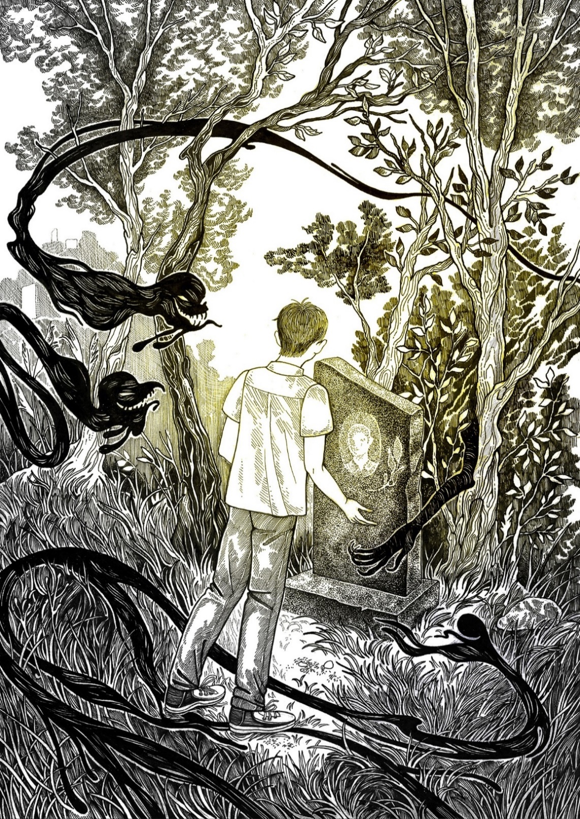 Однажды, в солнечный весенний выходной, Никита, гуляя по улице (теперь мама уже разрешила ходить одному, но пугать страшными историями принялась еще пуще прежнего) понял, что хочет проведать дедушку. Он сел в душный, битком забитый автобус и уже через полчаса был на кладбище. Могила деда, окруженная зарослями с двух сторон, находилась с края кладбища. Само кладбище было весьма заросшее и походило на лес с торчащими меж деревьев крестами.