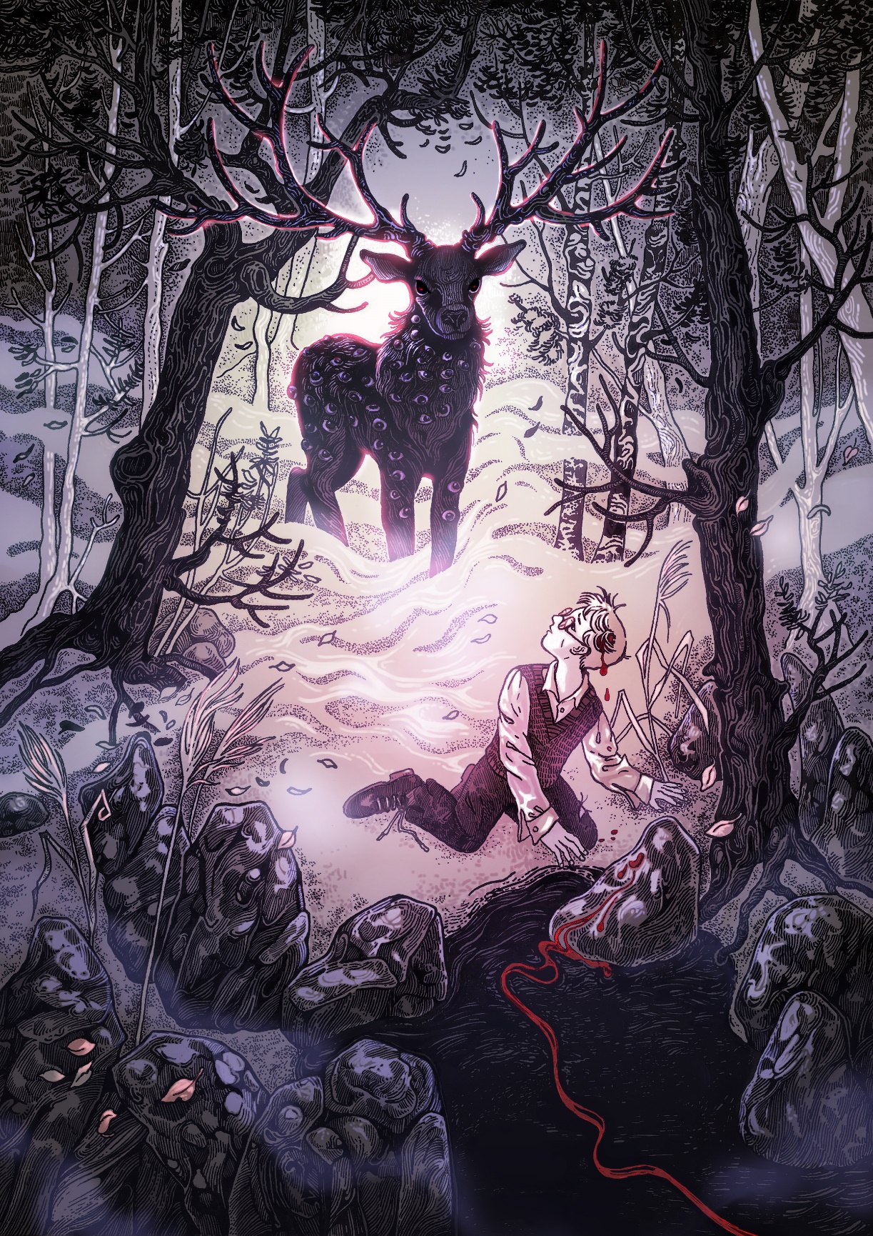 Стоило ему поднять глаза и посмотреть в сторону тропки, что привела его сюда, и он оцепенел – сначала от изумления, а затем от ужаса. Средь белого тумана вырисовывалась темная фигура. Олень – такой огромный, Марк никогда и не думал, что они бывают столь большими, стоял перед ним, преграждая путь. Он смотрел на мальчика – но не только двумя блестящими черными глазами, как все олени, он смотрел на него десятками глаз, рассыпанными по всему его серебристо черному телу. И глаза это были человеческие.