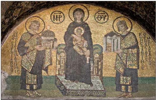 Императоры Константин Великий (слева) и Юстиниан Великий (справа) преподносят в дар Богородице, держащей на руках младенца Иисуса, город Константинополь и храм Святой Софии соответственно. Мозаика над юго-западным входом в Айя-Софию. Середина X века