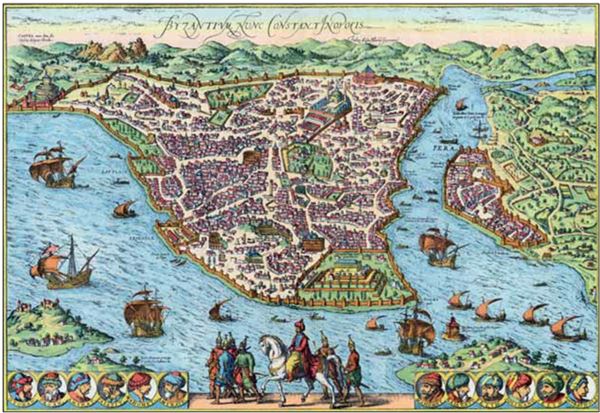 Георг Браун и Франц Хогенберг, 1572 год. На гравюре изображен Мехмед II, стоявший весной 1453 года перед византийской столицей (на территории современного Ускюдара). Хорошо видны размеры тогдашнего Константинополя, ограниченного городскими стенами