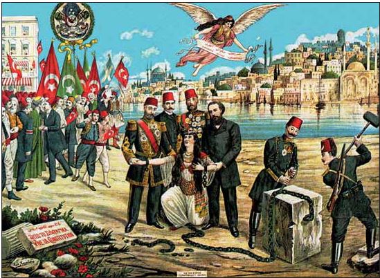 Турецкая открытка, посвящённая принятию первой конституции Османской империи 23 декабря 1876 года. В центре (слева направо): султан Абдул-Хамид II, принц Мехмед Сабахаддин, великий визирь Ахмед Шефик Мидхат-паша, а также один из организаторов и лидеров движения «Новые османы» Намык Кемаль. Женщина символизирует Турцию, которая встает с колен и сбрасывает оковы рабства. Ангел является намеком на Французскую революцию и ее девиз «Свобода, равенство, братство» («Hürriyet, müsavat, uhuvvet»)