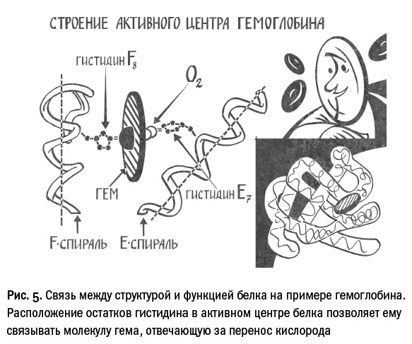 Классическим примером системы «последовательность – структура – функция» является белок гемоглобин, связывающий молекулы кислорода и углекислого газа и осуществляющий их транспорт в нашем организме. Эта функция гемоглобина определяется несколькими остатками аминокислоты гистидина, которые формируют так называемый активный центр белка. Если заменить один из этих гистидинов на остаток какой-то другой аминокислоты, такая молекула не сможет эффективно связывать кислород. Почему именно гистидин? В его состав входит поляризованный атом азота, способный удерживать гем – сложную небелковую молекулу, содержащую атом железа, собственно и связывающий кислород. Однако важен не только химический состав, но и взаимное расположение в пространстве. Остатки гистидина должны находиться на определенном расстоянии друг от друга и под определенными углами. Правильное взаимное расположение обеспечивается стабильностью укладки основных строительных блоков данного белка, которые носят название альфа-спиралей. В свою очередь, эти структуры формируются благодаря чередованию разных типов аминокислот: гидрофильных – любящих воду и гидрофобных – боящихся воды. Таким образом, зная лишь последовательность аминокислот в гемоглобине, мы можем уже довольно много сказать об этом белке. Также вышесказанное позволяет предположить, что гены, обладающие сходными последовательностями, часто кодируют белки с похожими структурами и функциями. Это теоретическое допущение на сегодняшний день имеет множество прямых экспериментальных подтверждений.
