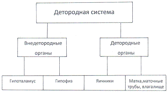 К регулирующим органам детородной системы принадлежат аркуатные ядра гипоталамуса и гонадотропные клетки гипофиза.