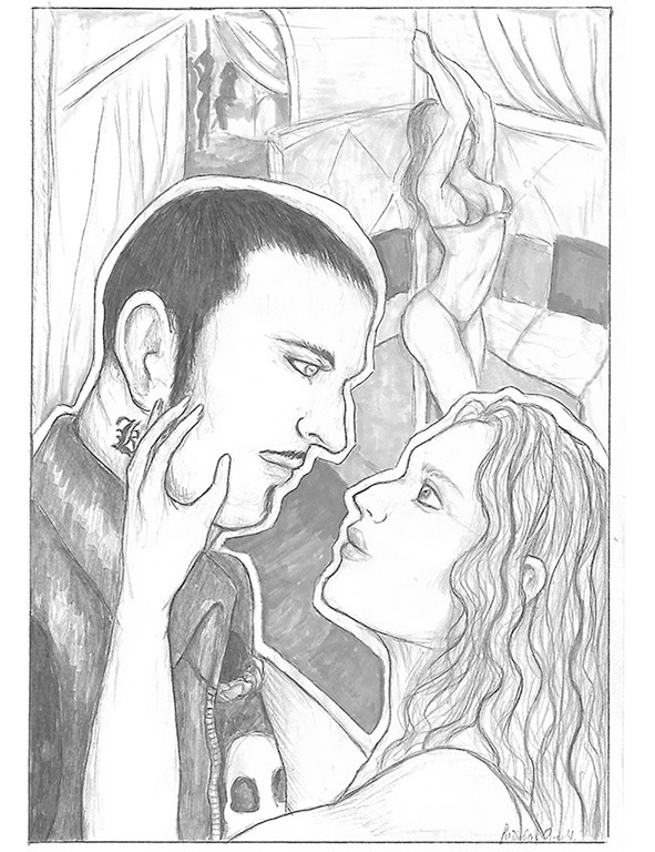 «Девочка» приняла решительный вид, взглянула на «дорогого гостя» несколько оценивающе, однако с некоей долей удивления: тот же ласковый, но безумно-мутный взгляд, а что там у него ниже твориться – даже знать не хотелось! Он стоял и улыбался поразительно открытой улыбкой в своём не менее сексуальном, чем взгляд, наряде: чёрные джинсовые брюки, чёрная обтягивающая футболка с белым крылатым черепом на груди, поверх отлично сидел фривольный расстёгнутый кожаный чёрный жилет, немного потёртый в нескольких местах, что только добавляло его владельцу брутальности, и завершала композицию свисающая с шеи металлического цвета толстая цепочка, чёрт знает из какого металла, но, наверное, не из простого – впрочем, она не разбиралась в этих побрякушках и не считала должным. На левой руке он носил браслет. Кажется, тот был из того же металла, что и цепь, да ещё в деревянной оправе. «Дерево какое-то странное, – смутилась мысленно девушка, – фиолетово-чёрное. Или это не дерево?..»