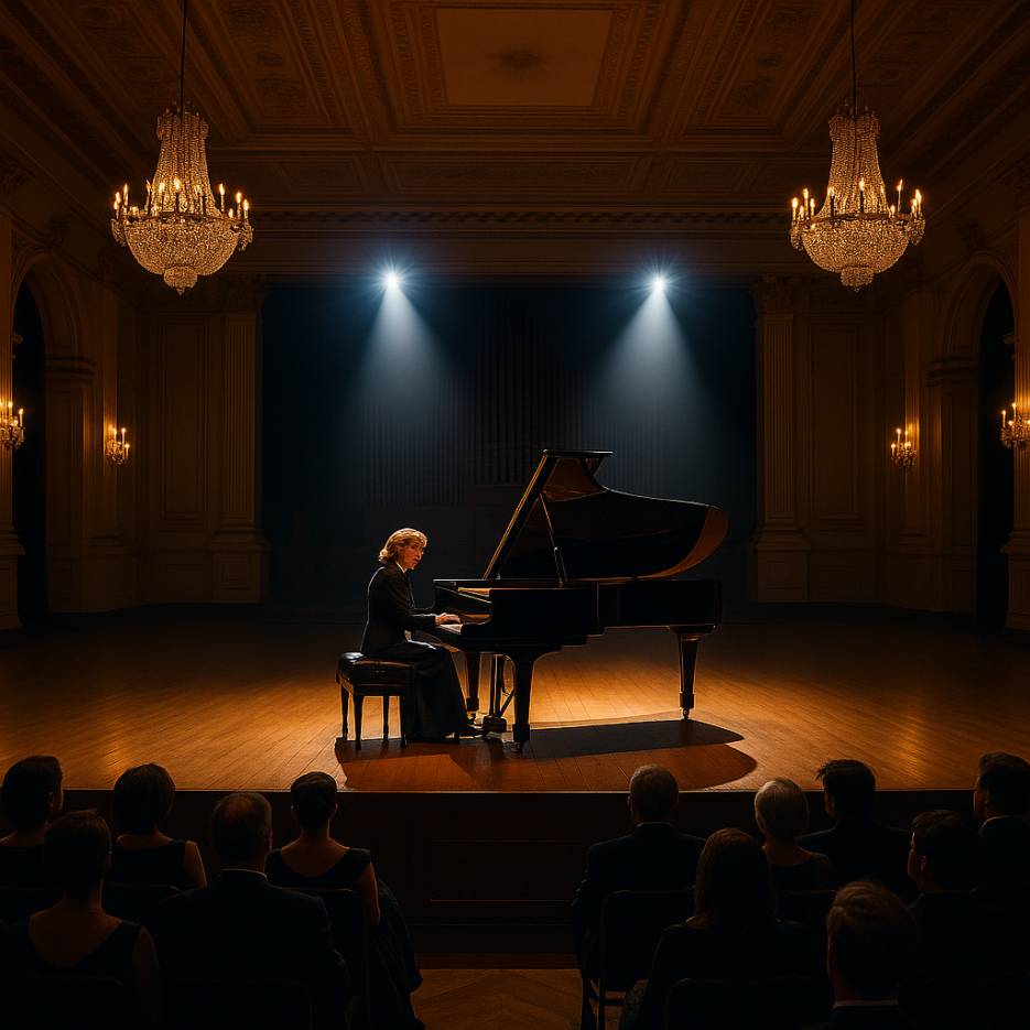Восемнадцатилетняя девушка в черном концертном платье грациозно поднялась на сцену. Ее темные волосы были собраны в элегантный пучок, а на лице играла уверенная улыбка. Елена была одной из самых талантливых учениц школы, и сегодняшний концерт должен был стать триумфом ее десятилетнего обучения.