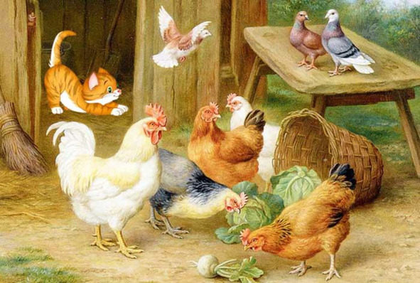 Ну а мелким сорванцамТесно бегать по углам,Воли в доме маловато,Рвутся из дому ребята.Из избы – на птичий двор,Наведут там сыр да бор.Куры носятся с испугуИ кричат на всю округу.Петухи наводят страх,Разнося все в пух и прах.А за ними кошка мышкуГонит, шустрая, вприпрыжку.Так и носятся до ночиКошка с мышкой, что есть мочи.А стемнеет, у окошкаСпать прилягут мышка, кошка.Спят в обнимку дружка с дружкойНеразлучные подружки.Ночью дружба их крепка.Баба давит храпака,Рядом с ней храпит и дед.Тишь да гладь, и горя нет.