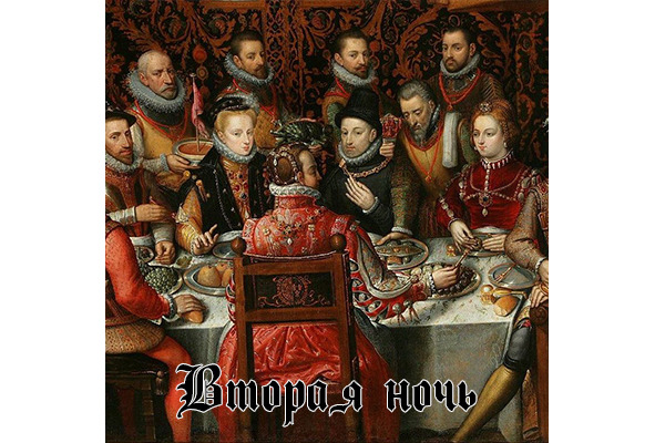 Спустилась ночь. Часы пробилиМгновенье, чтоб вернуться к былиЗемных утех, сомнений, споров,Сердечных встреч и разговоров.Какое счастье быть всем вместеНам в этот час и в этом месте,Разлукой боле не томясьИ крепко за руки держась.Пусть стены древнего дворцаСплотят сильнее нам сердца.Пусть будет ночь, как день, светла,А жизнь долга и весела!О, ваш приказ для нас закон,К тому же так приятен он.И ночь, бесспорно, ярче дня,Пусть веселит меня, пьяня.Гуляю я.И я.И я.Вам возражать никто не смеет.Всяк веселится, как умеет.Не в силах в этом усомниться,Сияют счастьем ваши лица.Но, вижу, есть лицо одно,Тоской оно омрачено.В такую ночь? Не может быть.Способен кто-то загрустить?(рыцарю)