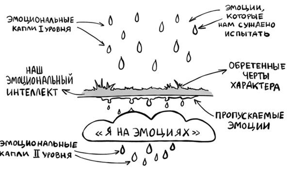 Я решила изобразить «эмоциональную последовательность» в виде капель дождя. Хотите вы того или нет, но дождь всегда влияет на наши планы и настроение. С эмоциями происходит то же самое. За один только день мы принимаем на себя столько «эмоциональных капель», что мне не хватит ни нервов, ни страниц, чтобы все перечислить. Поэтому давайте просто пройдемся по рисунку.