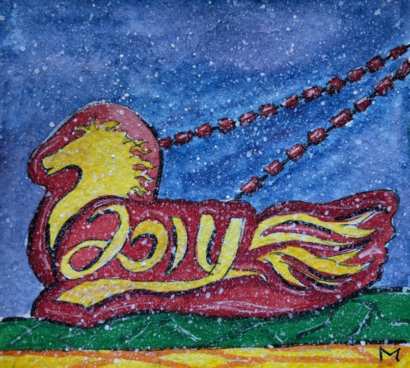 Также тут была установлена внушительных размеров платформа, украшенная золотой и желтой тканью, на которой стояла, хотя, скорее, неслась лошадь, все-таки наступал год коня. Правда от нее, лошади, остались только голова и хвост. Там, где должно быть туловище и ноги, красовались большие желтые цифры ”2014.”