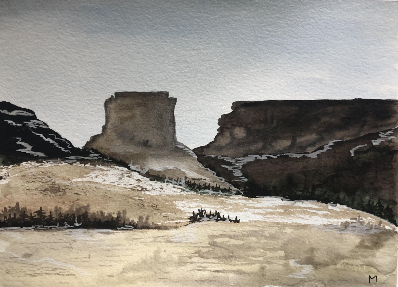 И так, мы покинули Денвер. Несмотря на конец декабря, снега не было. Точнее он был, но несколько локально. Справа и слева от дороги раскинулись соломенно-охристые поля с прожилками снега, редкими кустиками и деревьями. Горизонт подпирали серо-коричневые горы. Иногда от гор отделялись холмы и подползали ближе к дороге. Потом и горы придвинулись ближе. Они смотрелись очень необычно: песчано-серые с почти отвесными склонами и широкими плоскими плато наверху. Как будто ландшафтный дизайнер решил, что остроконечные вершины не вписываются в пейзаж и подравнял горы, как кусты в парке.