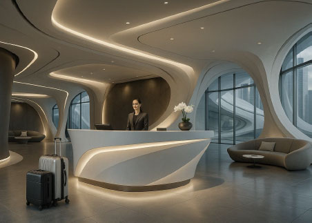 Отель может восприниматься как чистое, свежее, но обезличенное пространство. У клиента могут возникать ощущения холодной простыни, искусственного освещения, идеального порядка. Это может вызывать чувство свободы и расслабления, как и дискомфорта, оторванности, чуждости. Телесно, расслабление в теле, как на отдыхе, или наоборот – тревожное напряжение, если пространство незнакомо. Отсутствие запахов, приглушённые звуки, изоляция от повседневности делают отель «местом без времени».