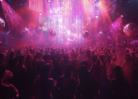 Ночной клуб, это храм ночной энергии, сцена, где исчезает дневная личина и проявляется архетипическое бессознательное. Он принадлежит к тем пространствам, где границы Я размываются в коллективном движении, где музыка, свет, телесность и анонимность создают особое поле инициации. Клуб, это место выхода за пределы, символ темной стороны праздника, современного Дионисийского ритуала. Здесь теряется структура иерархий, социальных масок, здесь действует другое измерение времени, взрывное, нелинейное, насыщенное пульсацией света, звука и страсти.
