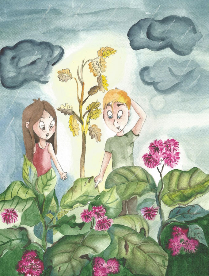 Рита немедленно скатилась с крыльца и понеслась к калитке. Через пару минут ребятишки, все мокрые до трусов, уже стояли на поляне у дома с оранжевой крышей, перед маленьким дубом.
