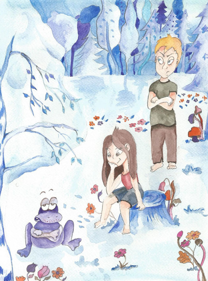 Ребятишки огляделись. Они оказались на небольшой полянке среди странных извивающихся деревьев с голубыми листьями. На полянке, помимо голубой травы, росло великое множество розовых, фиолетовых, лиловых и оранжевых цветов. Над ними в безумных хороводах кружилась бордовая мошкара. Солнце подсвечивало верхушки деревьев. Где-то совсем высоко небо разрезала изогнутая белая полоса.