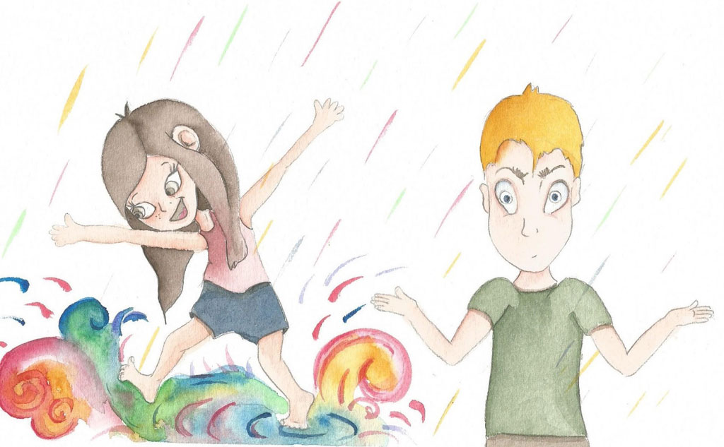 – Смотри, они сиреневые! Сиреневый дождь! – закричала она и подняла руки. – Нет, погоди! Оранжевые! И розовые! И есть синие! Все капли разноцветные. Это разноцветный дождик!