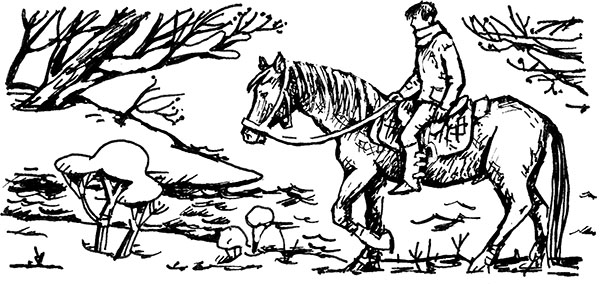 Однако Боб был вполне реален. У него бурчало в животе, время от времени он встряхивал гривой и фыркал, иногда срывал листья малины вместе со снегом, которыми они были припорошены, точно пирожное в сахарной пудре. Чтобы заставить его идти рысью, пришлось быть очень убедительным: лошади совершенно разленились, катая туристов. За ручьем я вынудил его перейти в галоп, он наконец продышался на бегу, встряхнулся, пошел резвее, явно получая удовольствие от движения.