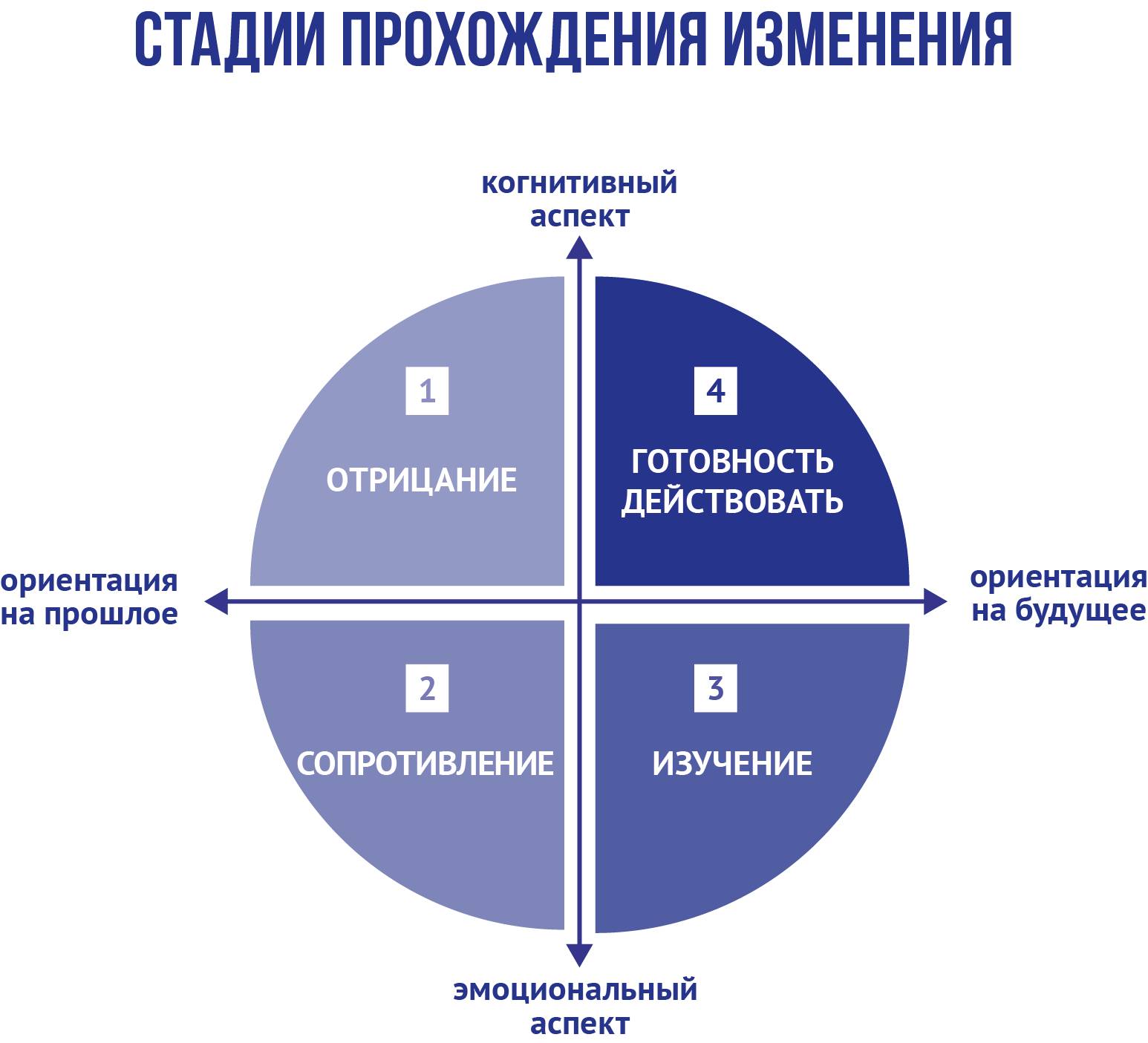 Каждый человек проходит через 4 стадии изменений. В разных теориях выделяют то меньшее, то большое количество стадий.
